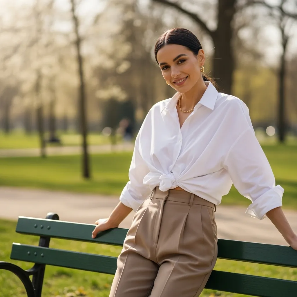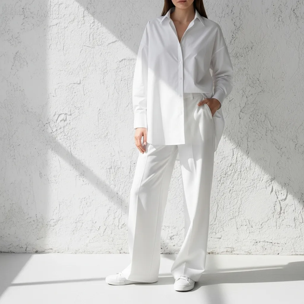 For a crisp, clean outfit that always looks expensive, pair a white oversized shirt with white jeans or wide-leg pants. Monochrome dressing automatically makes an outfit look thoughtful. The different textures (like crisp cotton and soft denim) keep it from feeling flat.