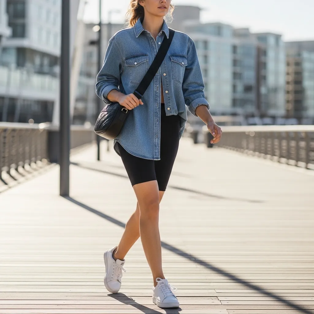 Feeling a bit more casual? Simply knot the front of your oversized shirt over a tank top and bike shorts or leggings. This is my ultimate weekend comfort outfit. It gives you shape and shows off a cute workout set or basic tee underneath.