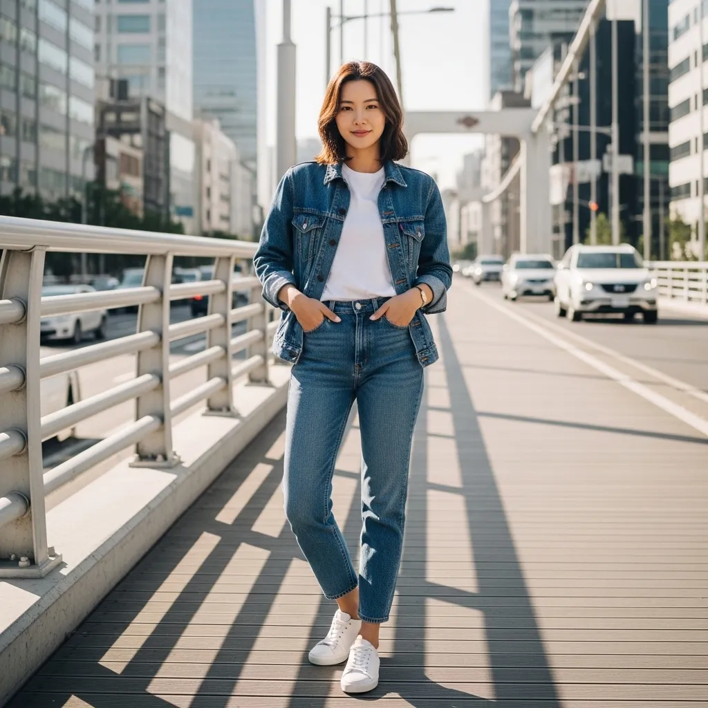 The Canadian tuxedo, Korean-style, is all about shade variation. Instead of matching my denim jacket and jeans exactly, I play with different washes. A light jacket over dark jeans, or a dark jacket over light jeans.