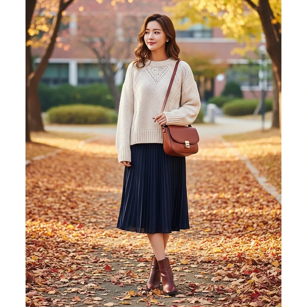 This combination is the epitome of soft, academic style. A flowy, pleated midi skirt (think tartan or a solid pastel) paired with an oversized, chunky knit sweater creates such a lovely silhouette.