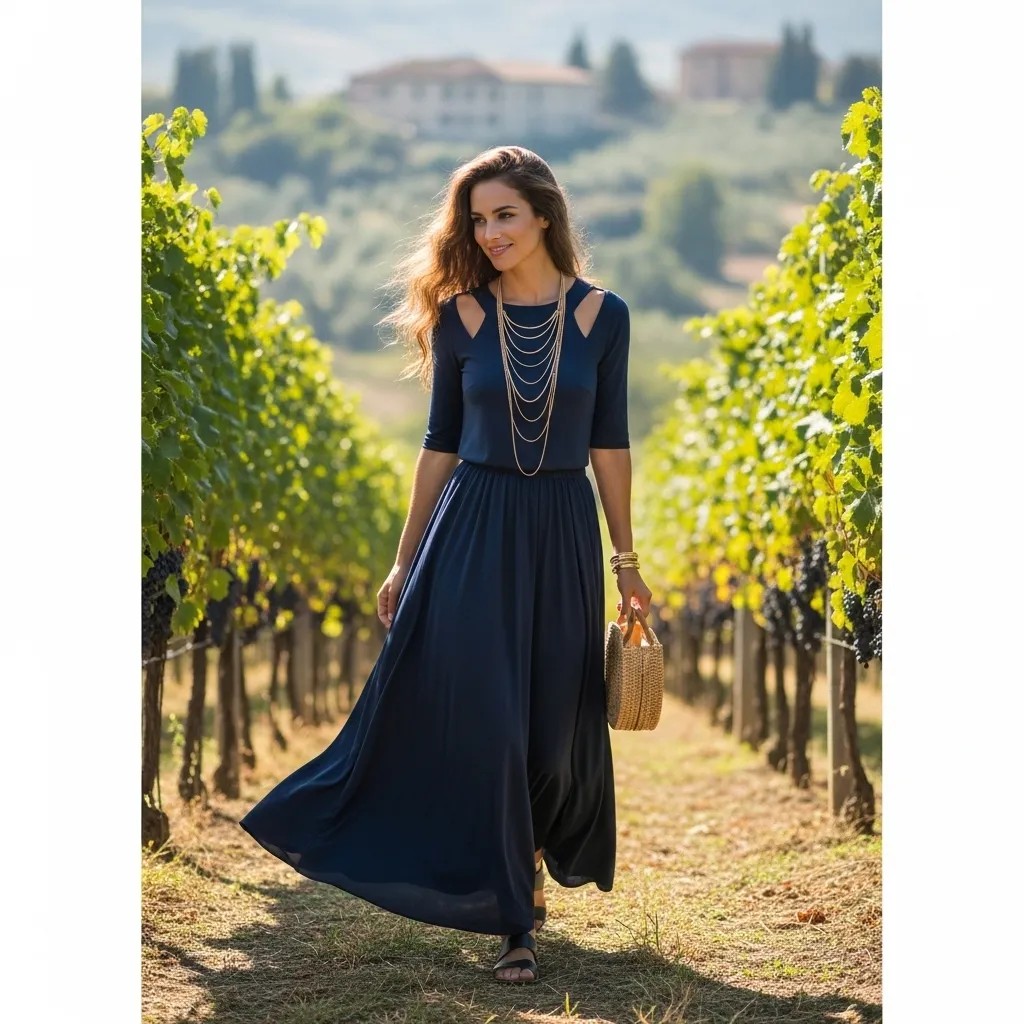 Pair it with a fitted, ribbed knit tank in a complementary color. Tuck the tank in and define your waist with a slim leather belt. The contrast between the structured top and flowing bottom is pure Italian romance.