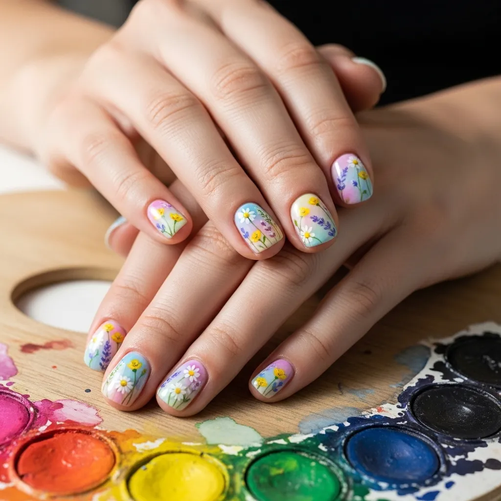 Embrace an artistic, soft-focus look with watercolor-style wildflowers. Use sheer washes of pink, blue, and yellow to create abstract petal shapes on a nude or white base.