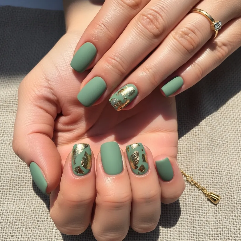 Pair the earthy, calming tone of sage green with delicate flakes of gold leaf. Apply the green as your solid base color, then gently press tiny pieces of gold leaf onto one or two nails while the polish is still tacky.