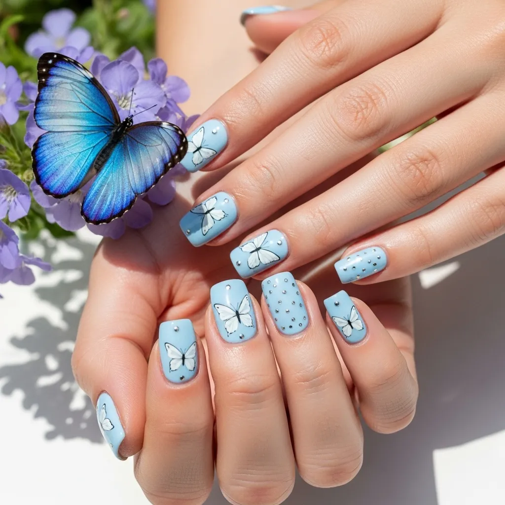 Combine a sky-blue base with tiny, delicate butterfly outlines. Use a fine brush or nail art stickers to add the butterflies in white or metallic silver.