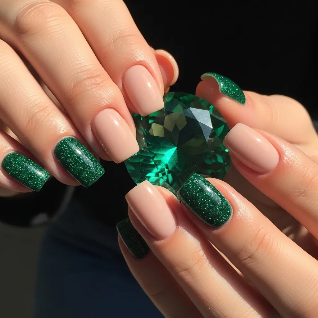 For a touch of jewel-toned drama, paint most nails a clean nude or soft grey. Then, make your ring finger shine with a deep, glittery emerald green.