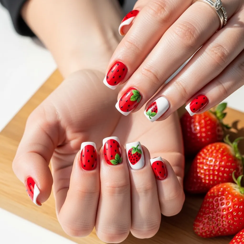 Get a head start on summer fruit inspiration with cute strawberry designs. Try a red base with green leafy tips and tiny black seed dots.