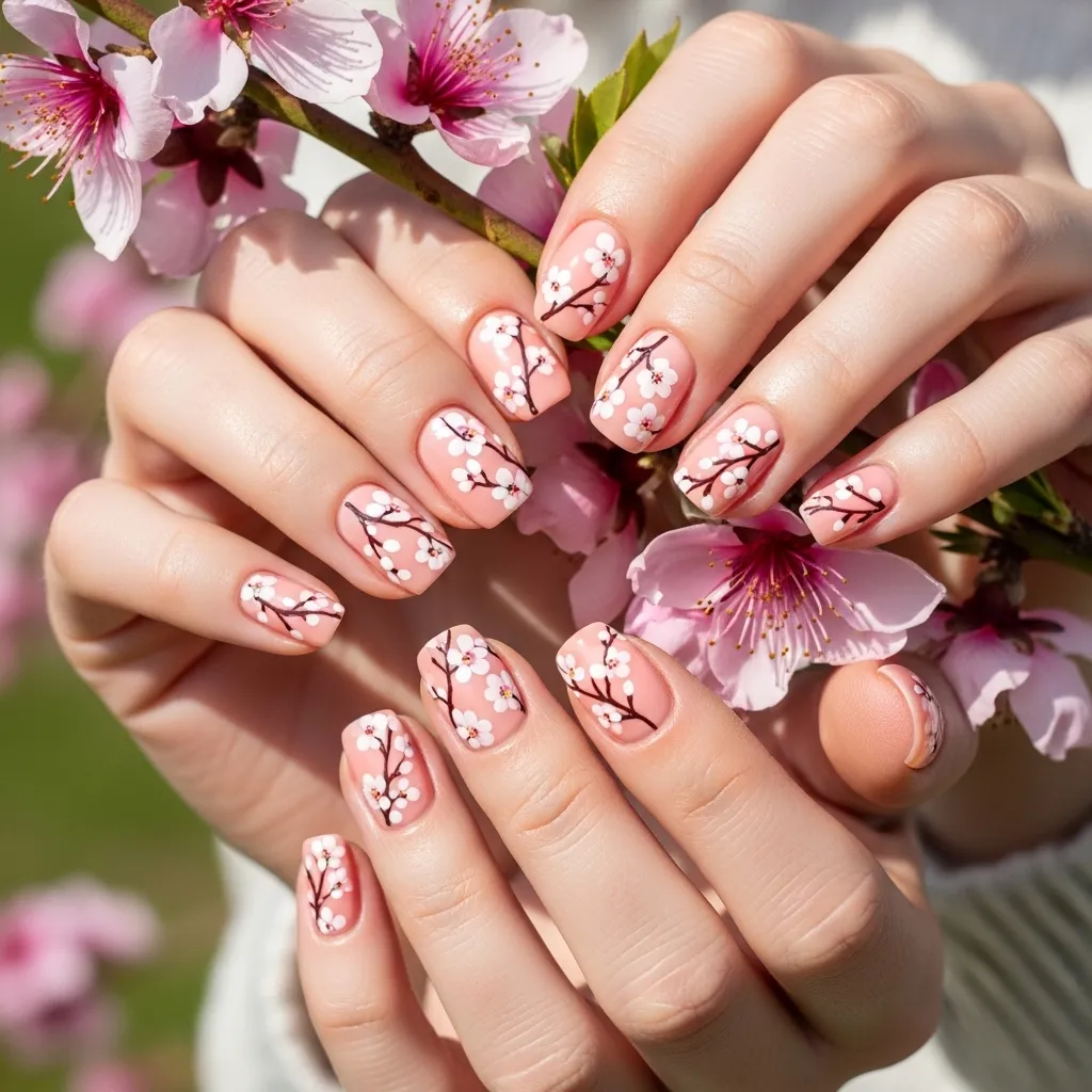 Create a tiny masterpiece with thin, wispy branches and delicate peach or pink blossoms on a transparent or nude base. It mimics the look of Japanese cherry blossoms.