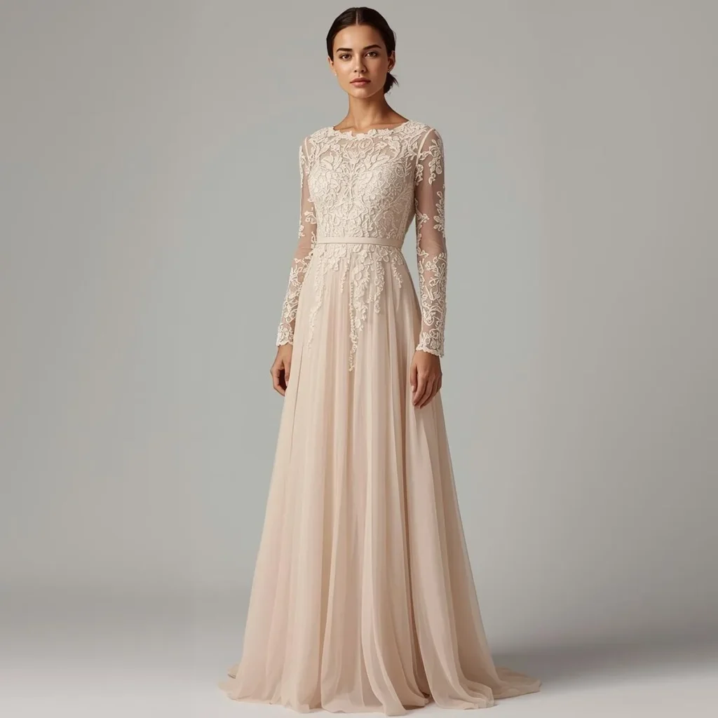 Long sleeves feel elegant and practical for cooler weddings. They add structure and balance.